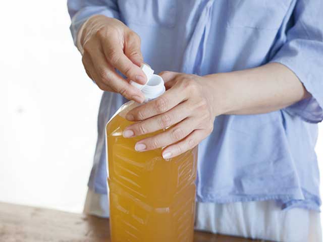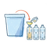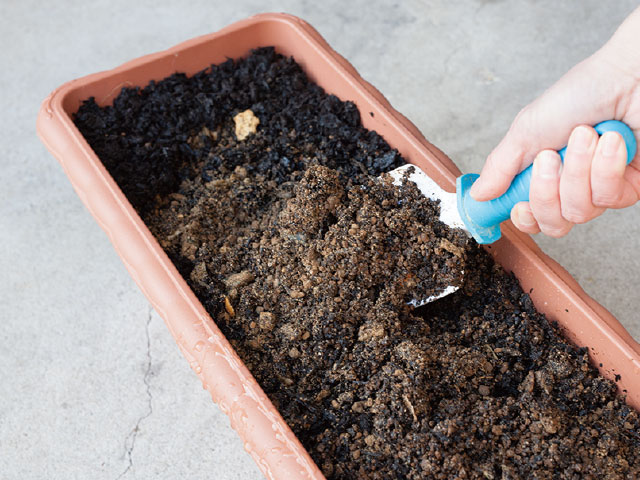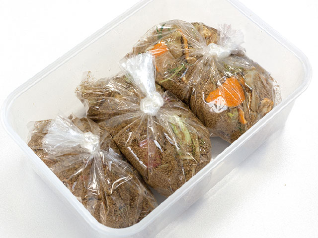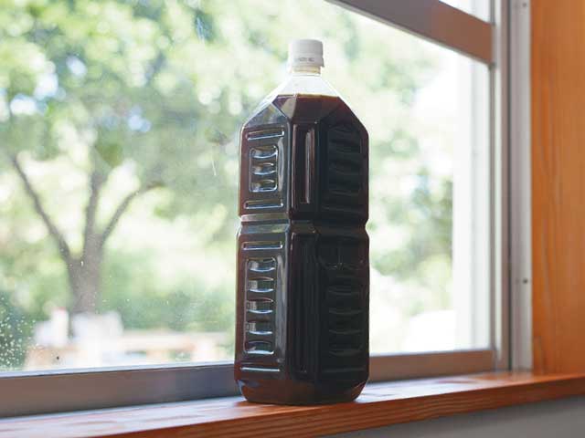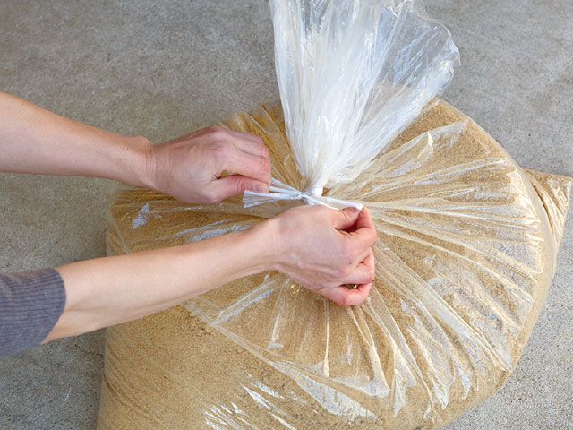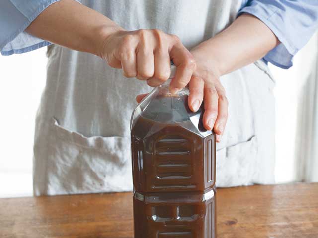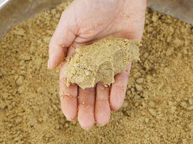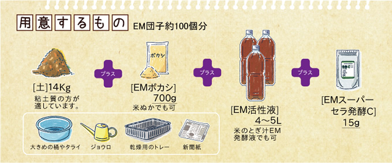使用する土の湿り具合に合わせて、団子状に固めやすい粘度になるまでEM活性液を加えます。 -