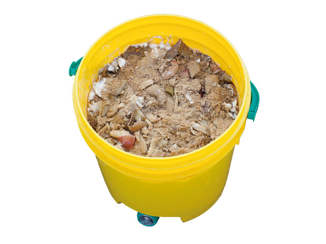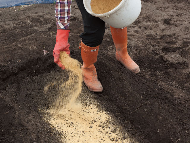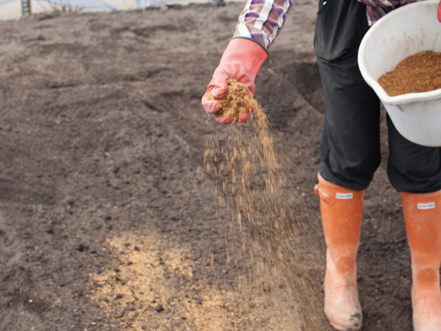 大きめの桶やタライに土、EMボカシ(米ぬか)EMスーパーセラ発酵Cを入れてよく混ぜます。 -
